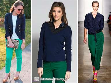- ярко-зеленые брюки хорошо смотрятся с верхом классического синего цвета;
