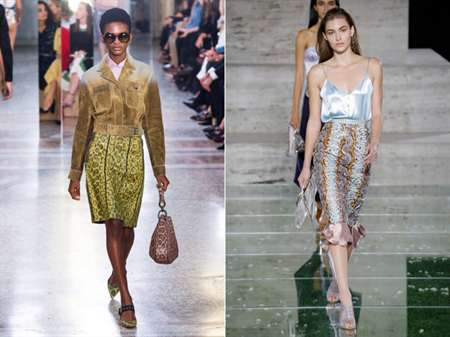 На пике популярности по-прежнему принты под кожу рептилий: змей, ящериц, крокодилов. Яркие цвета с такой юбкой будут как нельзя кстати.