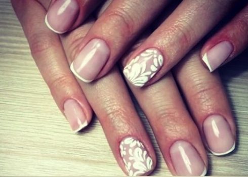 Френч с рисунком. Никто ведь не говорит, что сама основа и линия улыбки не могут быть полем для рисования неповторимого дизайна! На подобные эксперименты нэйл-мастера идут очень часто при выполнении свадебного и праздничного маникюра.