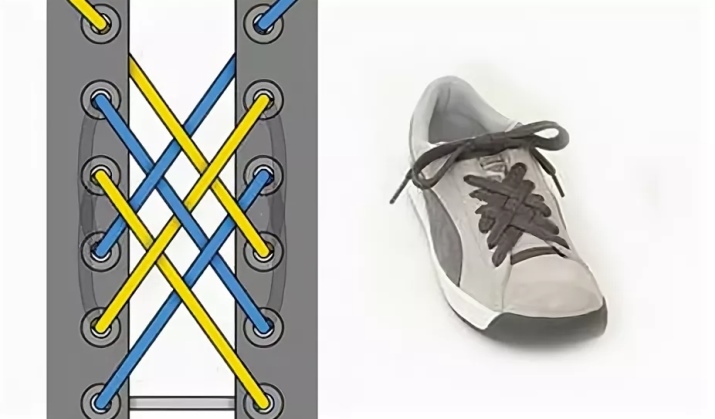 Если имеется желание зашнуровать кеды или кроссовки как-то иначе, можно использовать разноцветные аксессуары – это будет ярко, эффектно и необычно. К тому же можно выбрать любимые оттенки. Для этого нужно выбрать один шнурок, протянуть его через первые дырочки, а потом, скрестив концы, двигаться к третьему ряду. Затем взять шнурок другого цвета и следовать по той же схеме, но вдевать сначала в первые, а вытягивать уже в четвертые отверстия. Так обувь шнуруется до самого конца, после чего завязывается либо на бант, либо узелок.