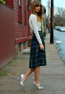 Составить гарнитур с входящей в его комплектацию миди достаточно просто. В зависимости от выбранной стилистики, юбку такой длины можно сочетать с разнообразной обувью. В приоритете каблук. Однако удобные изящные балетки, босоножки или женственные кроссовки также вписываются в данную композицию.