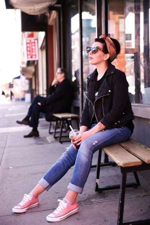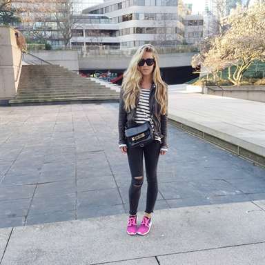 Яркие розовые кроссовки обычно играют в образе центральную роль, поэтому старайтесь подбирать к ним максимально простой и лаконичный образ. Часто можно видеть звезд, одетых во все черное, но обутых в яркие кроссовки, и именно этот элемент не дает внешнему виду стать скучным. Также как и в первом случае, в образ можно добавить два-три аксессуара в цвет обуви, чтобы он получился завершенным.