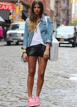 Следующее, что следует упомянуть, это материалы, с которыми хорошо сочетаются кроссовки любых цветов, и розового в том числе. Это кожзам, хлопок и джинса. Ниже показано, с какими комплектами из этих тканей кроссовки можно носить. На фото показаны весенние, летние и демисезонные образы.