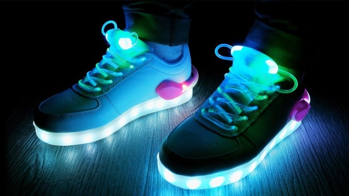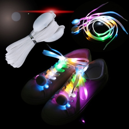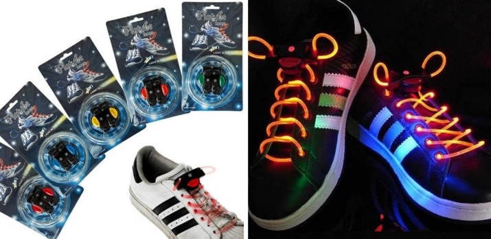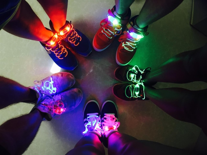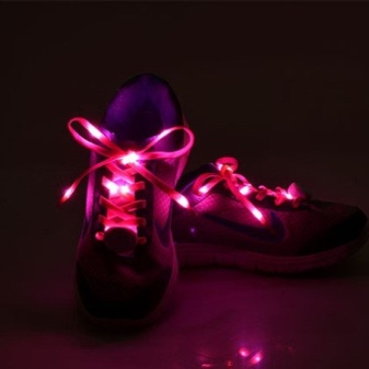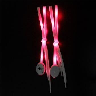 Светящиеся шнурки для обуви обрели большую популярность. Они могут быть разных вариантов: силиконовые, со специальной пропиткой и LED на батарейках. В дневное время они ничем не отличаются от стандартных шнурков, но как только начнет смеркаться, как их сразу заметят даже в толпе. Изделие состоит из веревки и базы, где есть два маленьких отверстия. Внутри производители располагают два светодиода, которые и являются источником свечения.